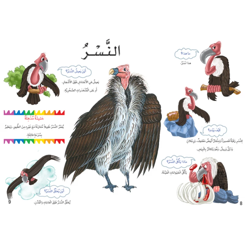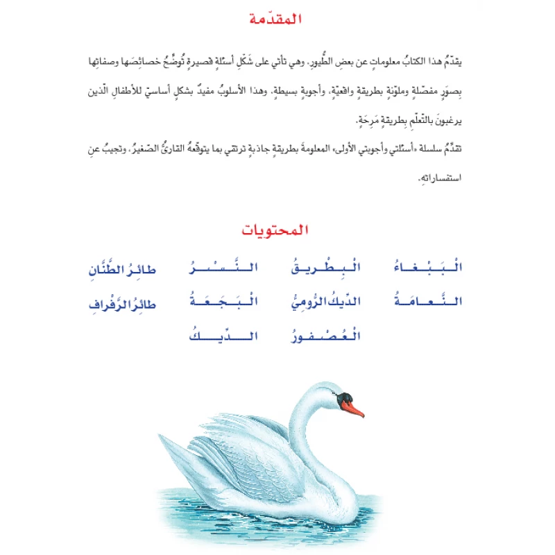 يقدم الكتاب التعليمي كتاب الطيور معلومات عن بعض الطيور. وهي تأتي على شكل أسئلة قصيرة تطرح على الحيوان وتوضح خصائصه وصفاته بصور مفصلة وملونة بطريقة واقعية، وأجوبة بسيطة، تشبع فضول القارئ الصغير، وتجيب عن استفساراته.