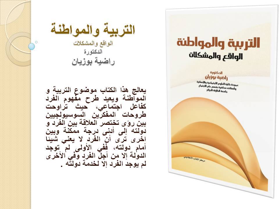 #كتاب_التربية_والمواطنة ، وفيه تبحث المؤلفة في الفصل الأول موضوع المواطنة : الأسس المفهمية و الأصول النظرية ، وفي الفصل الثاني "المواطنة - تطور الهيكل والمسار" وفي الفصل الثالث "التربية إلى المواطنة والمؤسسة التعليمية" وفي الفصل الرابع "الإطار المنهجي للدراسة" ، وفي الفصل الخامس "قيم المواطنة في كتب المواد الإجتماعية" وفي الفصل السادس مشكلات التربية الى المواطنة في المؤسسة التعليمية وتنتهي في الفصل السابع الى " النتائج العامة والإقتراحات. و يعالج هذا الكتاب موضوع التربية و المواطنة ويعيد طرح مفهوم الفرد كفاعل اجتماعي, حيث تراوحت طروحات المفكرين السوسيولجيين بين رؤى تختصر العلاقة بين الفرد و دولته إلى أدنى درجة ممكنة وبين اخرى ترى أن الفرد لا يعني شيئا أمام دولته, ففي الأولى لم توجد الدولة إلا من أجل #الفرد وفي الأخرى لم يوجد الفرد إلا لخدمة #دولته .
