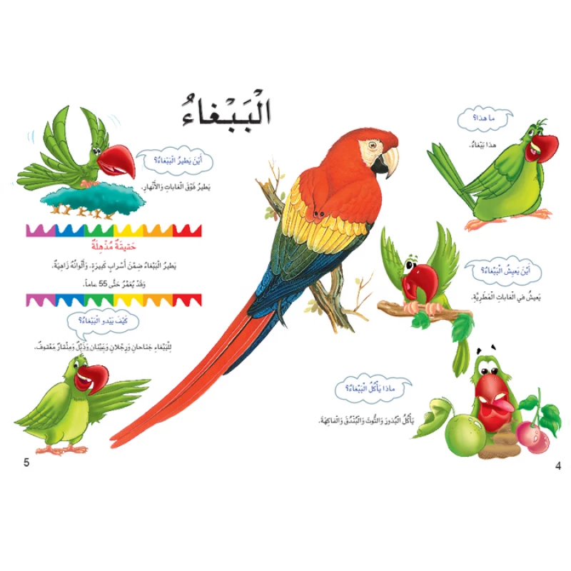 يقدم الكتاب التعليمي كتاب الطيور معلومات عن بعض الطيور. وهي تأتي على شكل أسئلة قصيرة تطرح على الحيوان وتوضح خصائصه وصفاته بصور مفصلة وملونة بطريقة واقعية، وأجوبة بسيطة، تشبع فضول القارئ الصغير، وتجيب عن استفساراته.