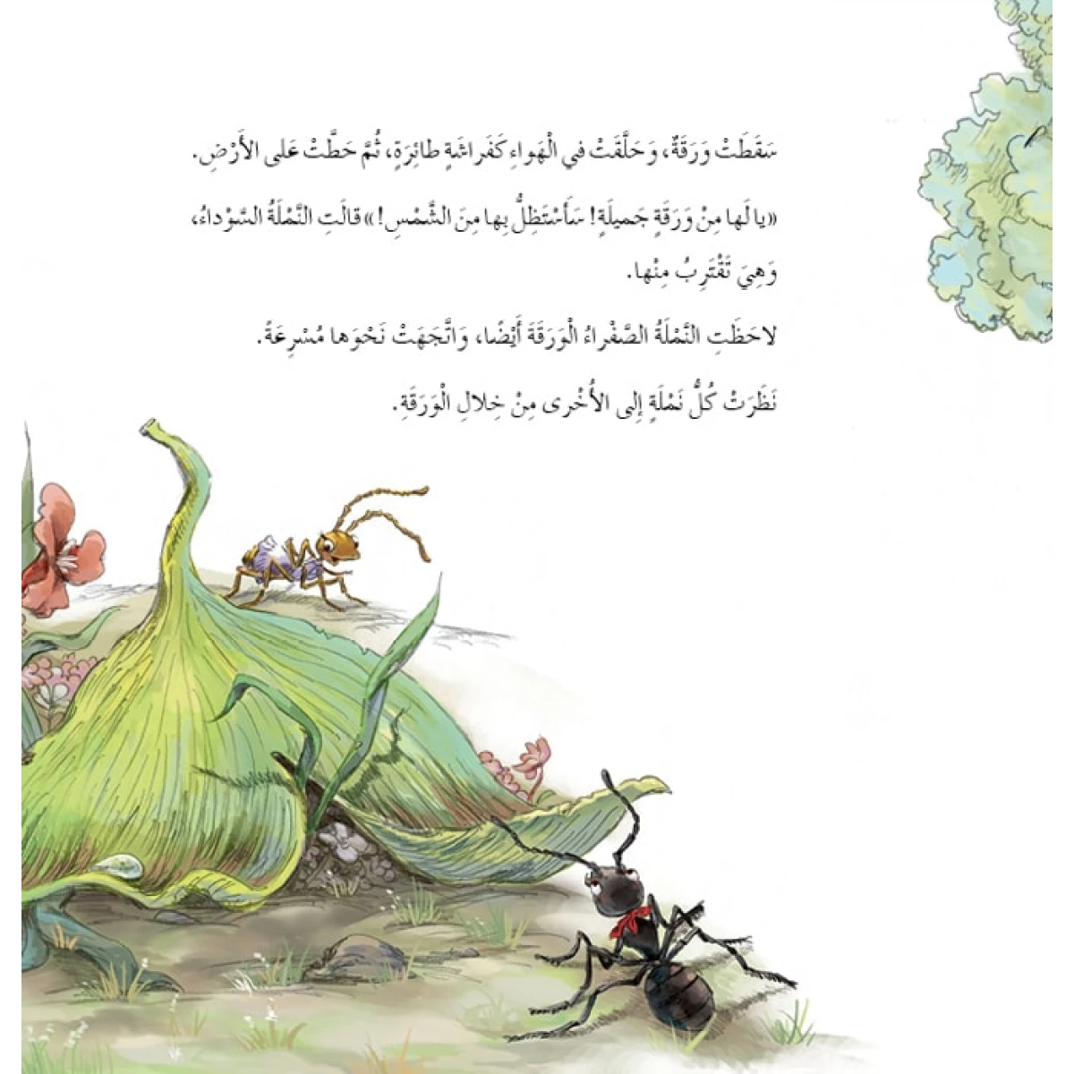قصة (ورقة ونملتان) هي قصة قصيرة للأطفال تروي حكاية النّملة السّوداء والنّملة الصّفراء والخلاف الذي وقع بينهما عندما سارعت كل منهما إلى الورقة التي سقطت من إحدى الأشجار وحطت على الأرض لتستظل بها في أحد أيام الصيف الحار. فماذا حصل يا ترى؟ وهل استمر جدالهما طويلًا؟
